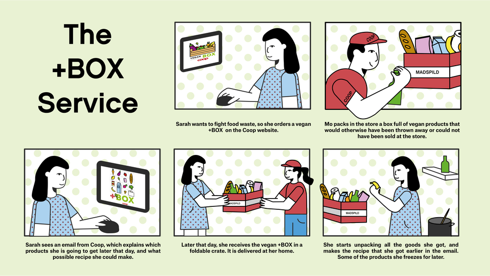 Coop is the largest retailer of consumer goods in Denmark. To contribute to their sustainable vision of the future and their fight against food waste, we created the +BOX. The +BOX is a consumer subscription on the product surplus of Coop. This means that consumers can order a box online, which will be delivered at home containing products that would otherwise be thrown away by Coop.