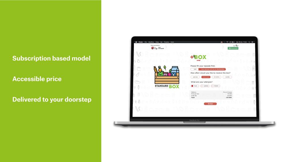 Based on desk research, surveys and generative techniques we saw that our target group of Millennials value sustainability, but also efficiency, value for money and easy planning of grocery shopping. To make sure it fits the needs of the target group, we altered the solution to meet them. The consumers only have to set up a subscription once and can decide how frequently they want the box and if they would like to have a standard, vegetarian or vegan box. Together with the +BOX comes a recipe and a list of products, to provide inspiration on what to do with the products inside and makes planning around the products easier. Additionally, the price is accessible, as we found out that millennials do care about how much they spent on groceries. The desirability of the service has been tested through a prototype with potential customers in Copenhagen, that have confirmed the interest in ordering the product.