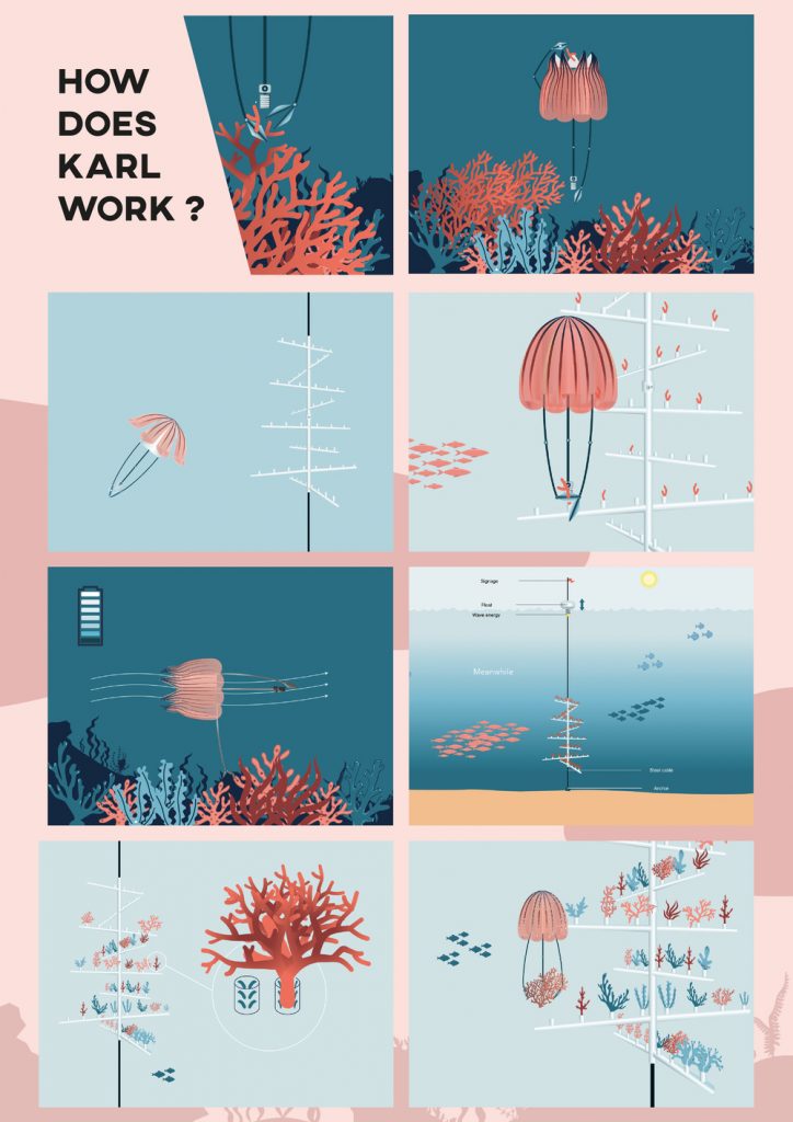 The coral is the bedrock of the submarine ecosystem, and today it’s endangered. We are imaging our world in the best future possible. From this departure point, we have created the project, named Color the Sea : is a system that allowed the sea bed to be recoralised at a large-scale. Thanks to submarines nurseries managed by aquatics drones named Karl. Karl is inspired by the jellyfish to ensures the best ergonomics movement.