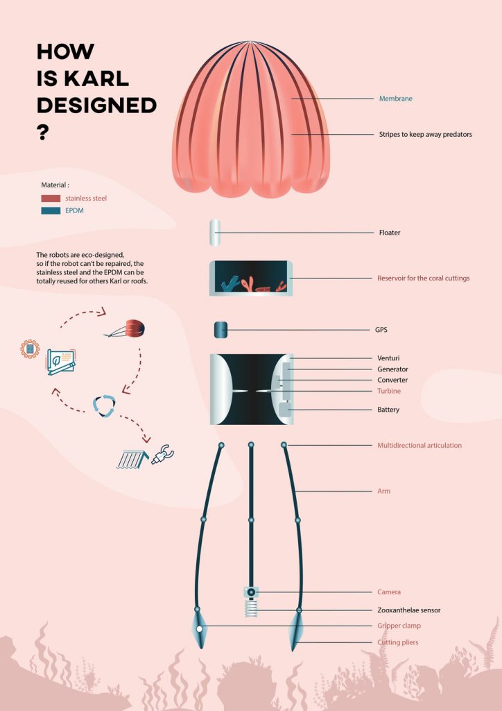 The nursery has been thought out so that it can then regulate itself thanks to the wave power to keep the corals at the perfect temperature to develop. During the 6 months when the corals are developing, Karl will be able to recharge itself thanks to his integrated tidal turbine which uses the force of the currents. Our robot is eco-designed so that it can be completely dismantled and recycled: its membrane is made of EPDM, a 100% recyclable natural rubber and its clamps are made of stainless steel, which is now a recycled material that can be recycled and recycled ad infinitum.