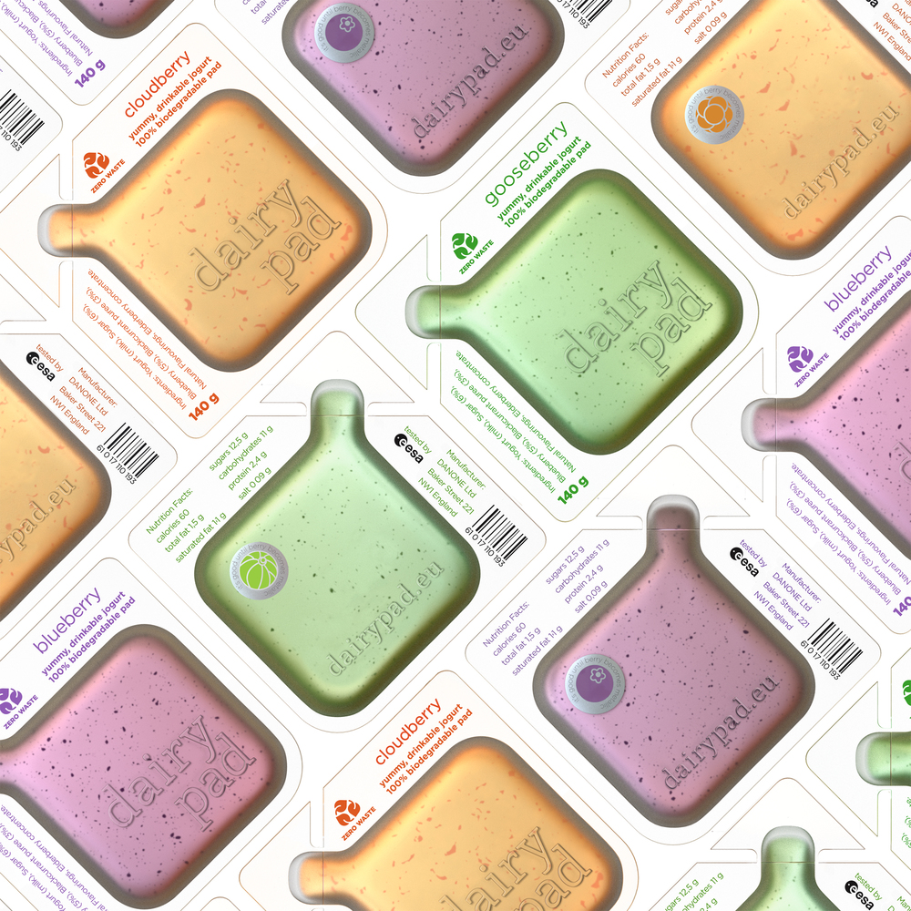 The packaging of “Dairy Pad” contains a single portion of drinking yogurt intended for people who value product freshness, convenience, and ecological solutions. It is a suggestion for lunch or a snack during the day. We wanted to create a product that could be adapted to the ‘on the go’ lifestyle, and which would be ecological at the same time. Moreover, we wanted to give an impulse to the packaging industry and create an alternative to single-usage plastic containers. We focused on making the project biodegradable and feasible. Besides, we wanted it to be fashionable, desirable, and attractive. The name, form, and graphics should evoke something modern and future-oriented, maybe even a little space-like.