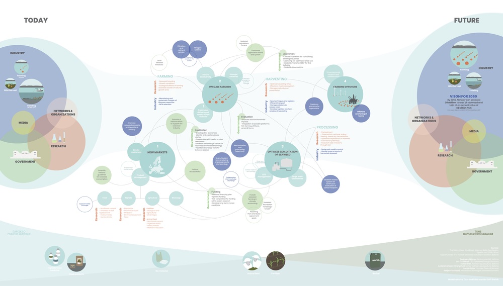We are at the beginning of a potentially large industry; seaweed farming. When upscaling seaweed farming, it is crucial to consider how the industry can be developed in a sustainable way, avoiding overexploitation and harmful interference with the marine ecosystem. Through a systemic approach we have mapped the situation today and the important steps to upscale the industry. Our research have been based on scientific reports and conversations with experts and organisations within the industry, science and government. The roadmap is designed to be a tool for discussion and reflection. Illustrating how cross-sectorial collaborations and common goals is key to upscale the industry. One of the main findings is the need for a national strategy where we have identified four key goals; “new markets”, “upscale farming”, “optimize exploitation of seaweed” and “offshore farming”. By highlighting the importance of multiple focus areas, collaborations between relevant stakeholders and shared responsibilities, we hope to provide an applicable tool for discussion and reflection.