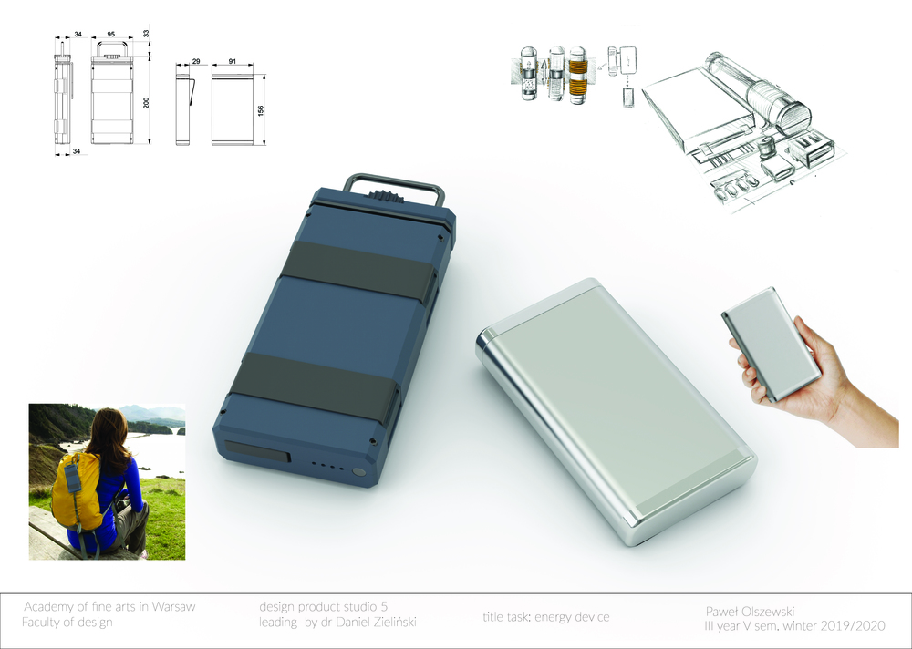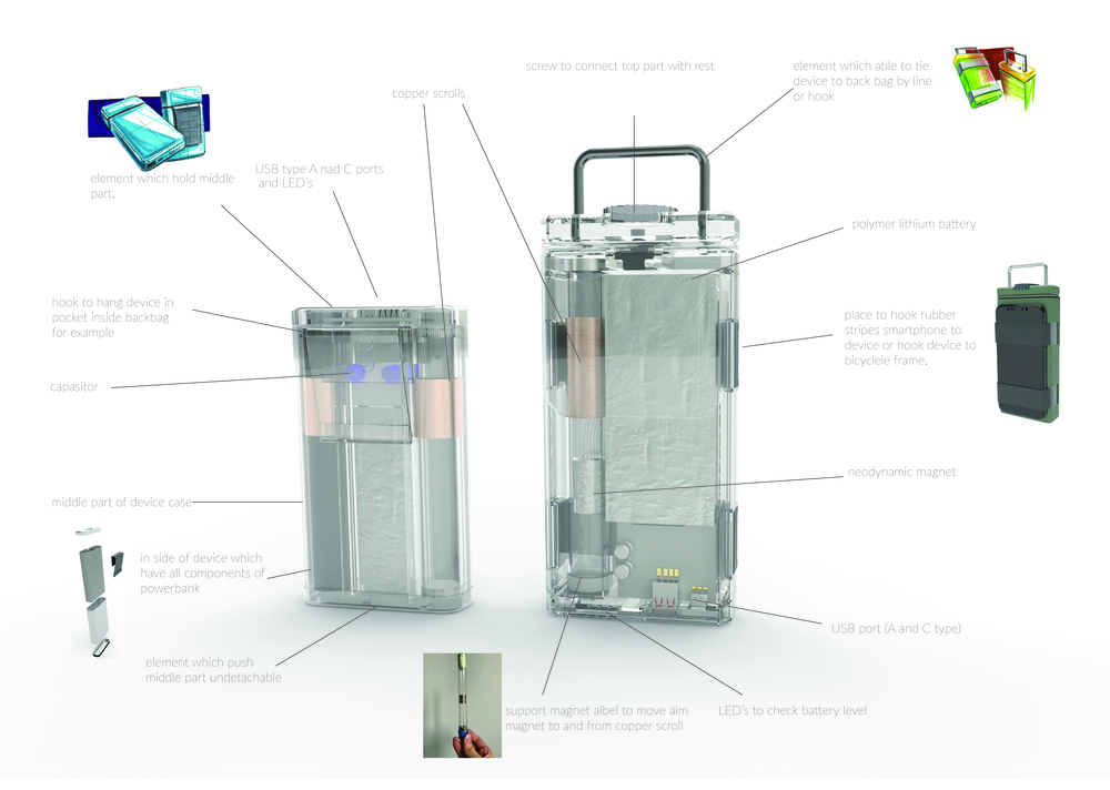 The target group are people who want to live more eco-friendly lifestyles, are looking for something simple to use, and don’t want to lose time charging powerbanks in the traditional way (connect to kontakt). My research process was simple. First I analyzed the solution we have now, and after I analyzed them and consulted with my professor, I chose the best solution. I developed this idea by traditional sketching on paper to find a good form, and made one simple experimental model to try to put a second magnet as a damper (pluses directed to themselves). I checked the way to find a solution that would charge batteries by farraday’s law without using additional human force. Later I used Rhino to make 3-D models to show more details in the case and inside of the devices.