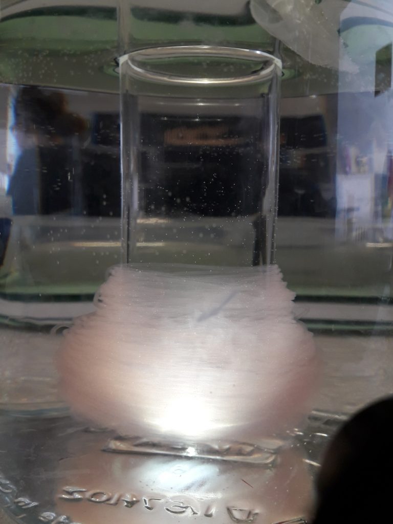 Processing the biomaterial from a liquid state in filiform without compromising the alga inside, it is possible by using alginate characteristics and textile technique “wet spinning”. By replacing and modifying some elements, I build a machine capable of polymerizing alginate in microfibers. It consists of processing a continuous flow of alginate through a needle in a calcium solution with rotary flow, so that the alginate in contact with the calcium solution will instantly polymerize into a filiform thanks to the continuous flow. Extend as much as possible our notions about the relationship nature, man, environment and technology. An eco-sustainable and ethically correct solution for the benefit of both nature and man, looking to the future of materials towards a reality of mutual respect and coexistence, sensible not only to a cleaner world, but in caring for the whole natural sphere in search of symbiosis.