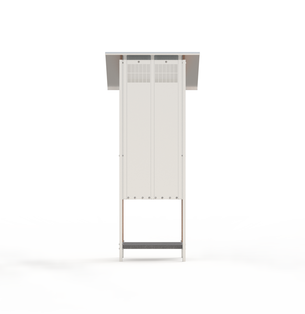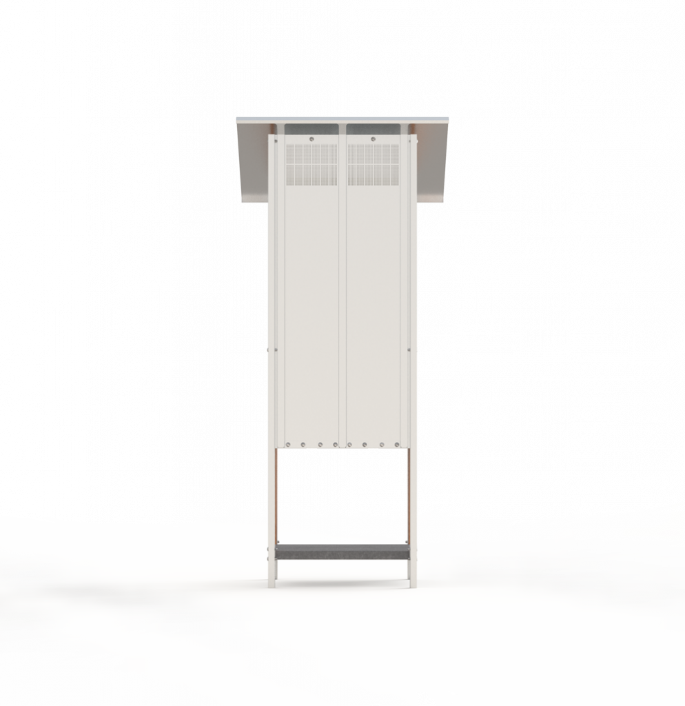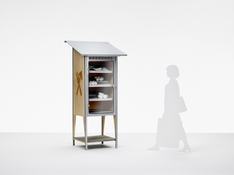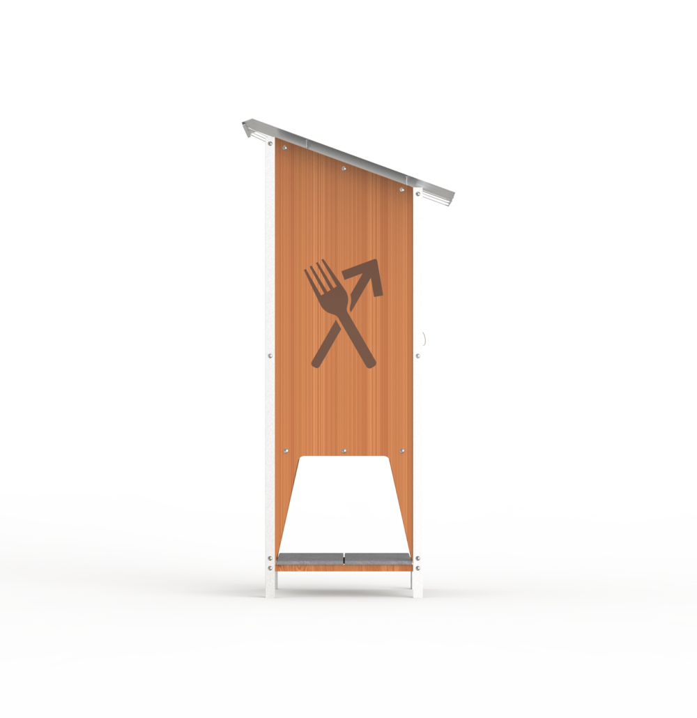 All Freddi parts can be pre-produced and shipped on two Euro pallets. The two materials larch wood and aluminum dibond are very different, but both impress with their stability, insulation and food compatibility. The dibond is milled, folded and welded. This is how it forms the complex shapes, while the larch parts serve as a reference to the traditional market stand. The door has no handle, but a loop to have a soft element as a greeting.