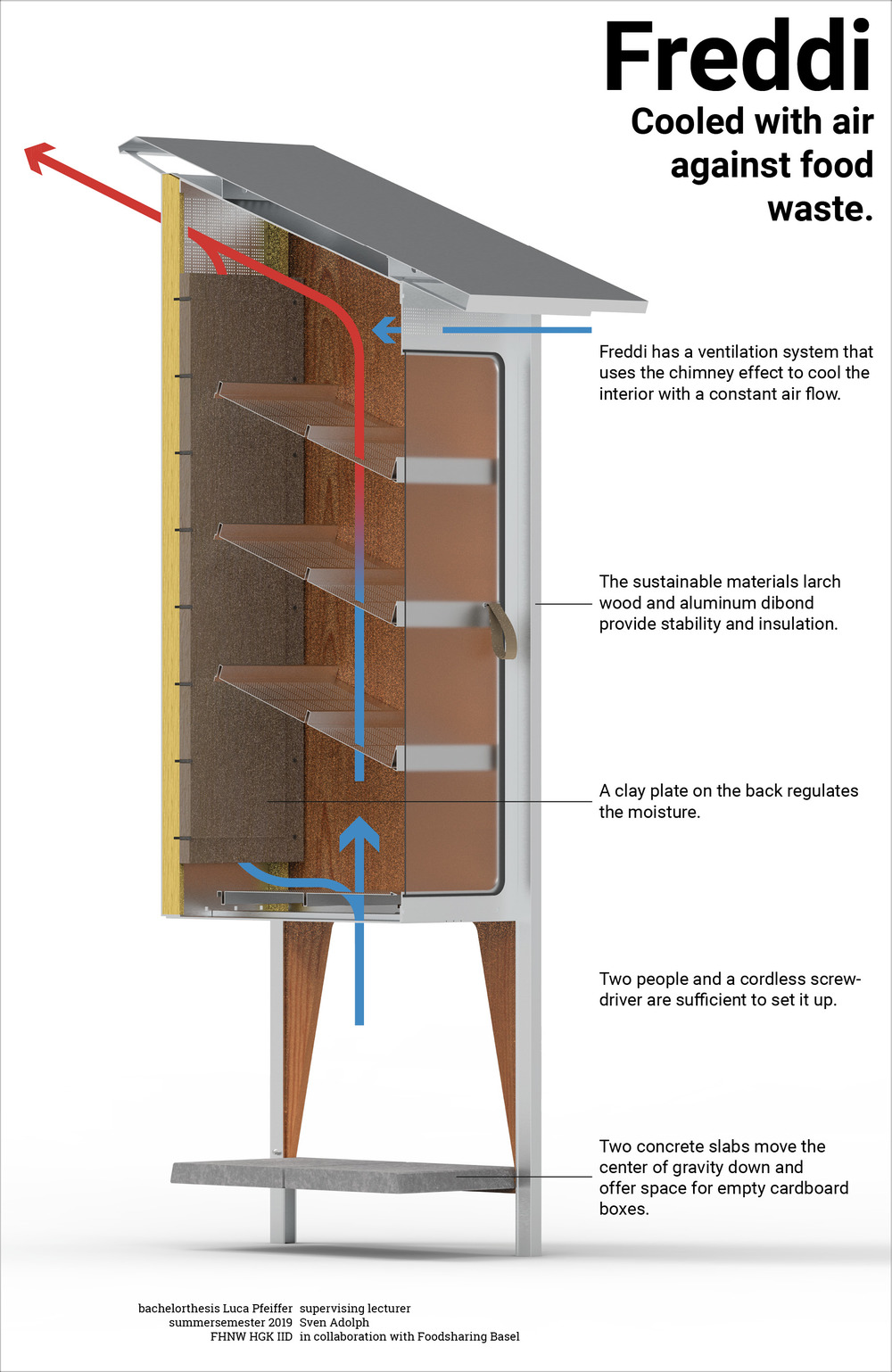 Today about a third of all food is thrown away. The people from the Foodsharing Association work against this and collect food from supermarkets to make it available to everyone free of charge. Freddie is the next generation of these distribution stations. It is quick and easy to assemble and generates a chimney effect that keeps the interior cool. A clay plate on the back binds excess moisture and thus prevents mold. The stored vegetables stay fresh longer and are rather picked up and eaten!