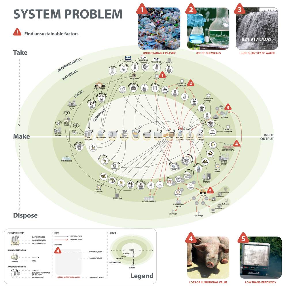 The project aimed to enable stakeholders to see ecological, social and economic unsustainable factors in current linear cheese production system. Our mission was to transform current take-make-dispose linear model to a self-generated open system by providing a systemic perspective. Through collecting qualitative and quantitative data of input and output, we visualized material and energy flow of whole process of cheese production activities. These visual narratives highlighted the impact of cheese production on ecology environment and promoted shared understanding between designers and stakeholders.