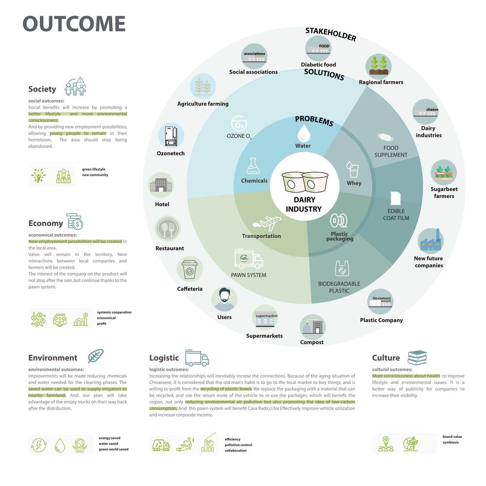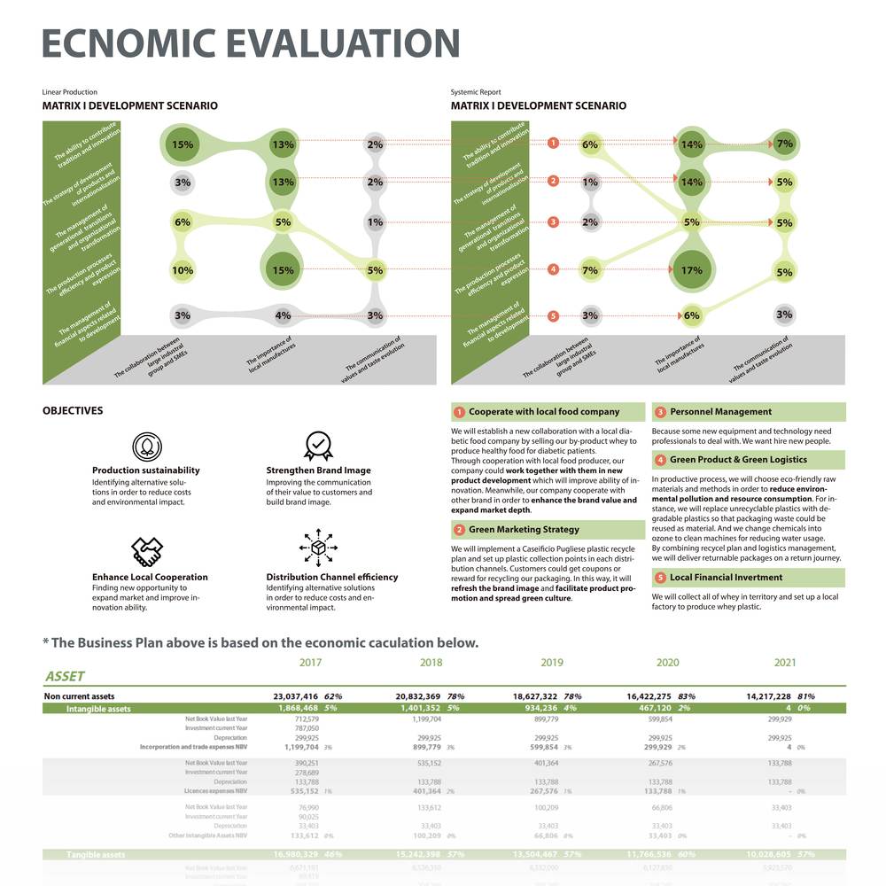 Five problems can be diagnosed, which are related to material or energy consumption and waste treatment. From the source, unsustainable materials and methods were designed out. During the production, wastes and by-products were treated as resources. After use, closed-loop recycling, resorting, reusing chain were built. More specifically, in order to minimize negative externalities, we chose eco-friendly materials from the source. We replaced non-degradable plastic packaging that have negative impact to natural systems. We used ozone to clean machines, which is quick to remove organic materials and reduce water usage. Through communicating and reconnecting with local food companies, we transformed the by-product whey buttermilk into valuable food products which meet the demand of diabetic patients in northern Italy.
