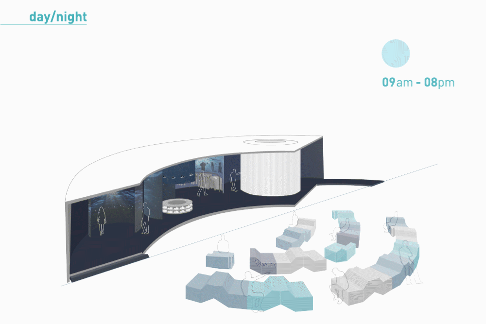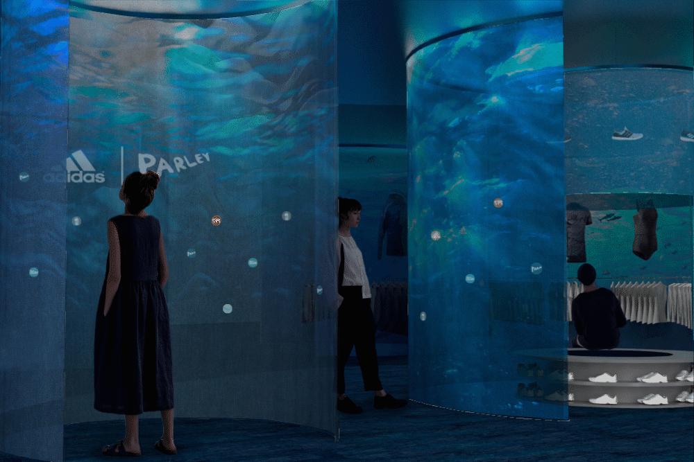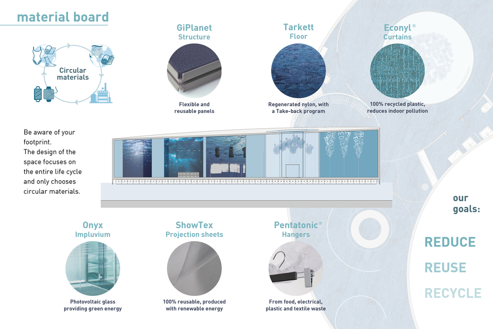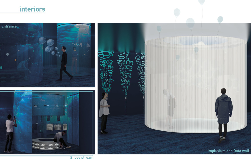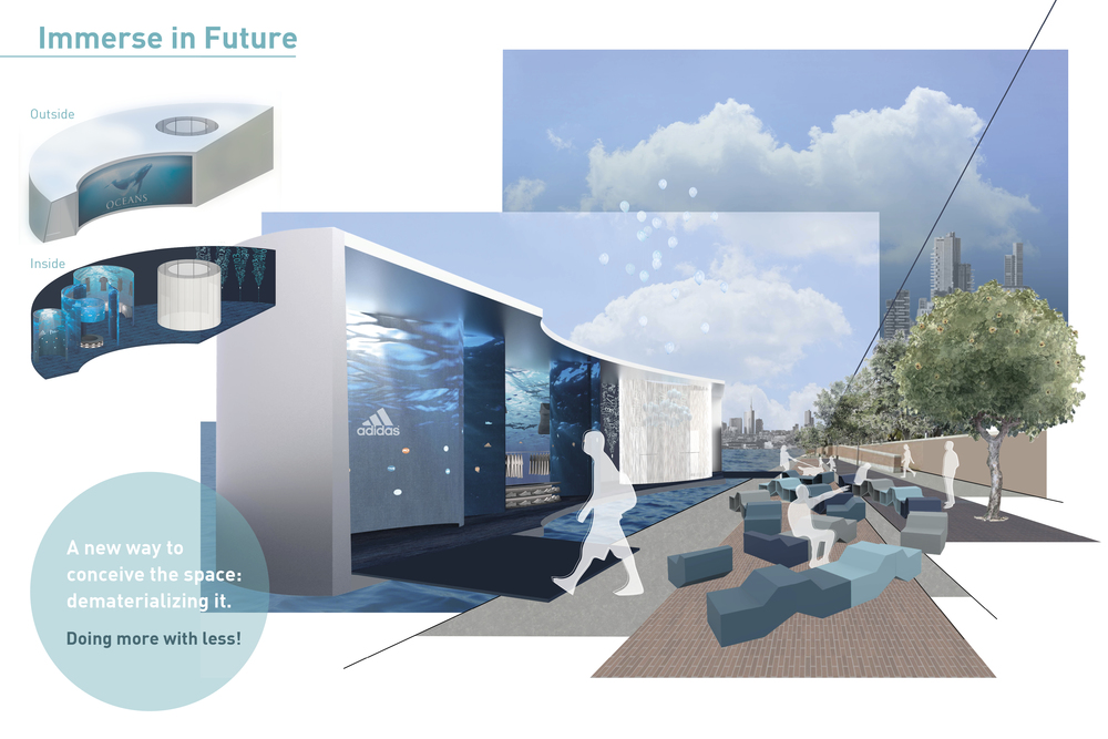 “Immerse in Future” won an academic competition launched by Politecnico of Milano in collaboration with Adidas, the creative brief of which was to design a PopUp store that communicates the sustainability of the brand, addressing the Z generation in particular. For this reason, our main stakeholder is definitely Adidas. However, this new interior design approach is not only applicable to the retail world, but can also be extended to many other sectors: Exhibitions; Museums; Fairs; Public spaces. As a matter of fact, any installation area can benefit from our proposal. Not only by reducing footprints, but also by giving financial advantages, thanks to investments in resources that can be used over and over again.