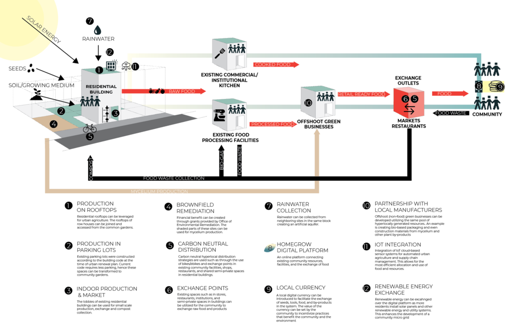 The ongoing student-led project was initiated in late 2018 in collaboration with community organizations. The co-location of food production and consumption at the hyperlocal (neighborhood) scale addresses the issue of responsible production and consumption of food not only for the environment but also for the equity of underserved/lower-income communities that disproportionately bear health and economic burdens. The concept of the project emphasizes micro-scale production which will achieve a larger scale through a digitally-enabled connected network of micro-producers, with the aim to allow micro-producers to be competitive with corporations.