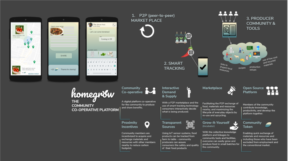 The project’s goal is to establish and support a distributed hyperlocal system of the food value chain – of food growers, producers, and outlets under a Commons-Based Peer Production model (as opposed to hierarchical business constructs) where land, food, knowledge, and other local resources are effectively maintained under a “commons”. Regenerative urban agriculture is supported by technology – via a community-owned digital co-operative and commons platform. The system will incorporate blockchain and IoT automated systems for urban agriculture/food production and supply chain management, and circulate a community digital currency that will enable the development of a new real (non debt-based) agriculture centric economy. It will also be a one-stop-shop for community users to share knowledge in urban food production, and link users to each other as well as to resources such as vacant time slots at commercial/restaurant kitchens to incubate and accelerate local food enterprises.