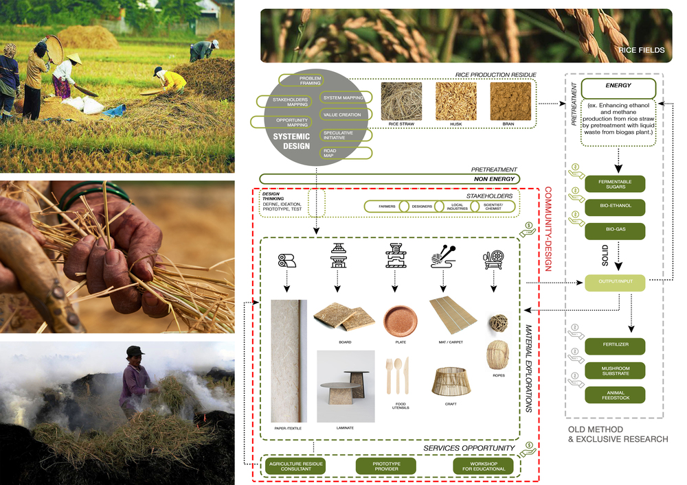 Therefore, within our collective lab we propose a design system where focusing on; Social Product-Service Design, creating the local most needed items with a collaboration with manufacturers, craftsmen, chemist/scientist and designers to be able to apply circular and collaborative economy where rice co-product being an additional source of income for farmers, local artisan, and community development; Mediation Lab, this mediation lab is a workshop format organized around the creation of objects and materials from rice crop waste that open for sharing to the public for educational contribution. Therefore, the setting up of this collaboration scenario will allow imagining solutions for the future.