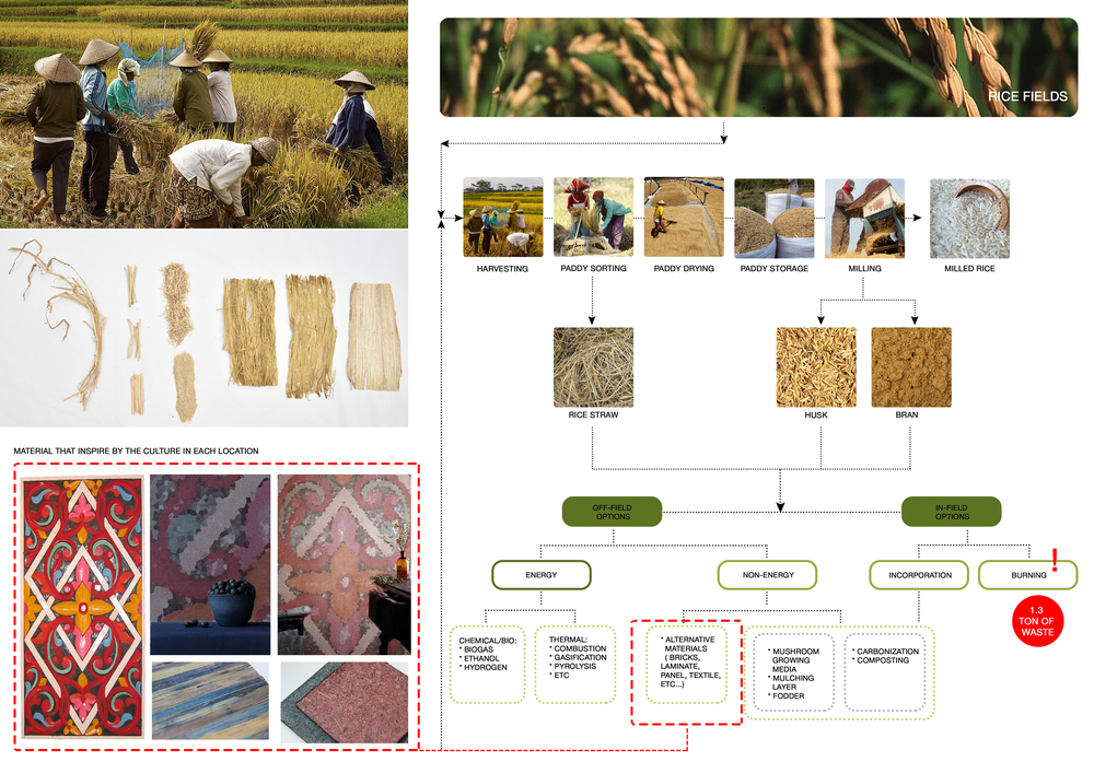 Oryza derived from Ancient Greek; ὄρυζα, also come from Persia and Sanskrit; the plant comes from the East. Rice is the second most-consumed cereal in the world then as a result, farmers need to deal with an environmental problem such as agriculture residue approximately up to 1.3 billion tonnes per year on a global yield scale (Indonesia), which brings another domino effect of crop burning activity. From the straw burning, it created the fine particles that throwback into the atmosphere then contribute to the phenomenon of the greenhouse effect. Within this collaborative system, we propose to develop a lab including research, product making and workshops with the local and other networks in every different area which have a similar issue. Together with the advancement of technology and science also the collaboration between different stakeholders, this project could change the problem into the solution along with the cultural value of the selected area.