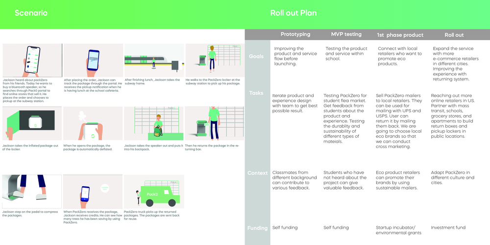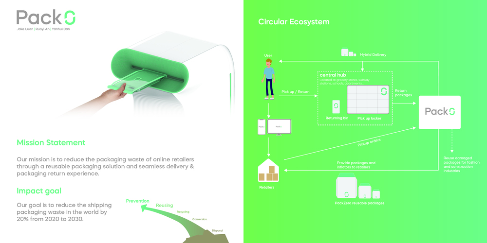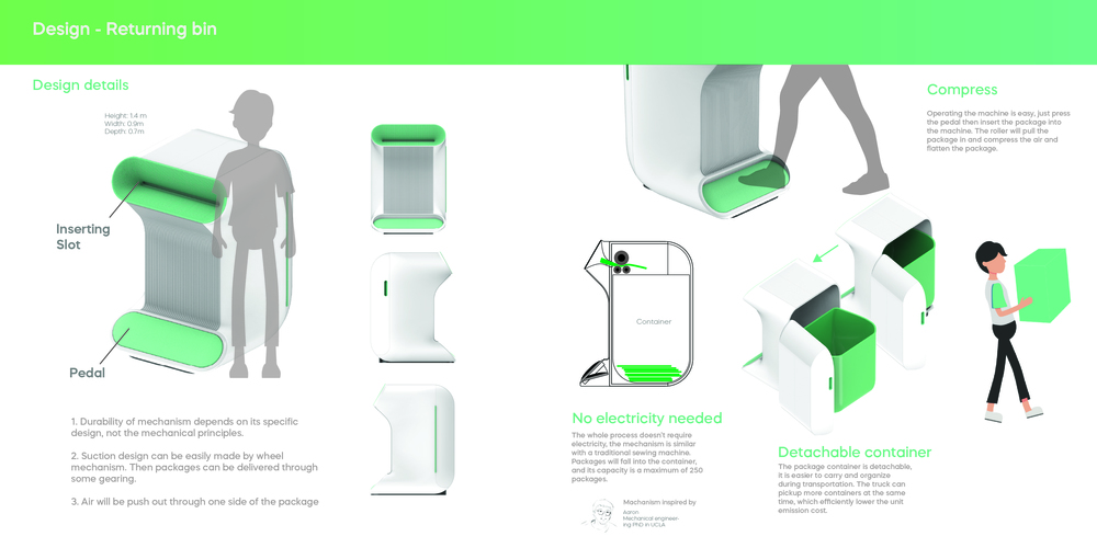 Our design combines inflatable reusable packaging with hybrid pickup and delivery experience. The inflatable reusable packaging can protect the product. The packaging deflates when it’s opened. User can easily return the packaging to the returning bin, which has a physical mechanism that can compress the packagings. This process can help us pickup more returned packagings each time, so that the unit emission cost of each packaging return will be reduced. Likewise, we choose to build central pickup and delivery hubs at locations that users frequent or find easily accessible. The overall ‘product miles’ is lower than deliver to door.