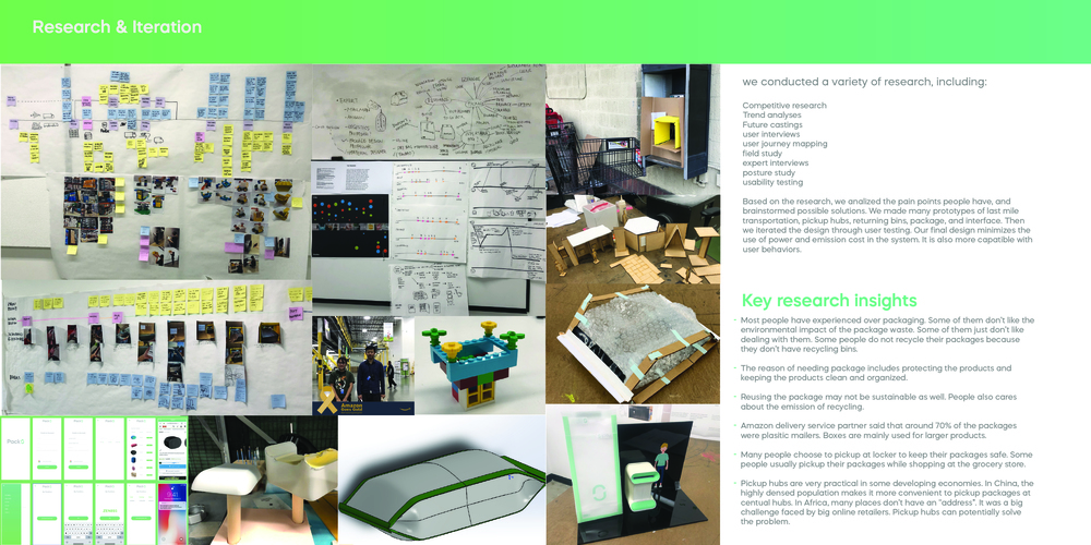 Research In order to design feasible and engaging human experiences, we conducted a variety of appropriate research, including user interviews, user journey mapping, field study, and posture study. We also did competitive research, trend analysis, expert interviews, and KJ method to further understand the market and find the better solution. We learned that many people don’t recycle because they don’t have access to the recycling bins. Some people just don’t have time to spend on recycling. But most people feel badly about throwing away packing materials, and consider breaking down the boxes as time and energy consuming. We visited an Amazon fulfillment center, Amazon delivery station, and Amazon hubs, and learned about the process of fulfillment and last mile delivery. The emerging pickup hubs are changing behaviors, allowing people to pickup their deliveries while engaged in grocery shopping. Based on the research, we brainstormed many solutions around centralized delivery system that can not only reduce the use of packaging waste, but also reduce the emission caused by last mile delivery.