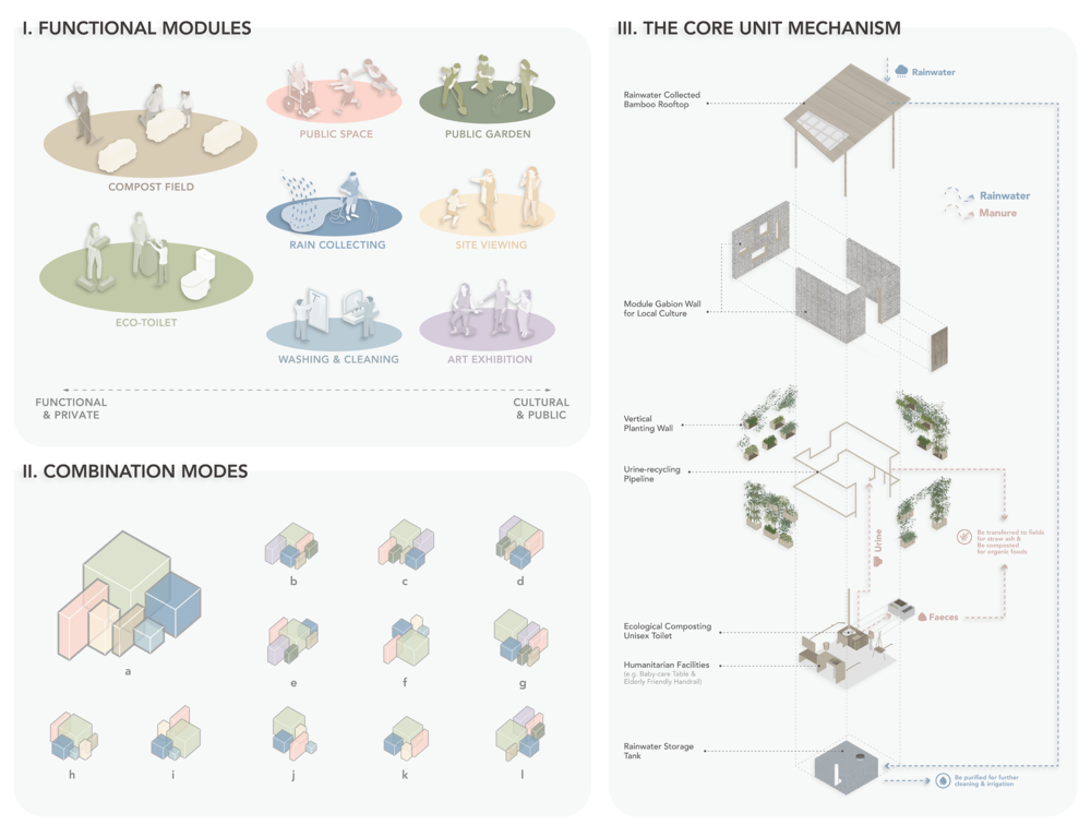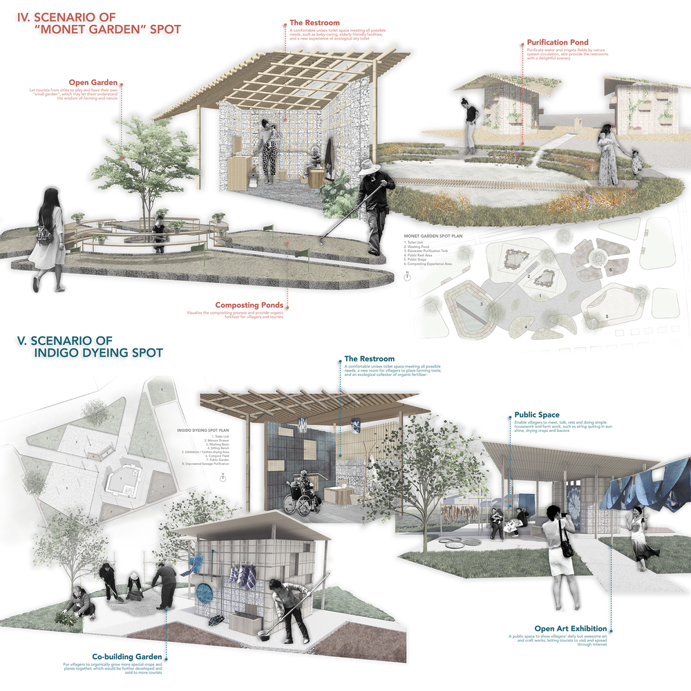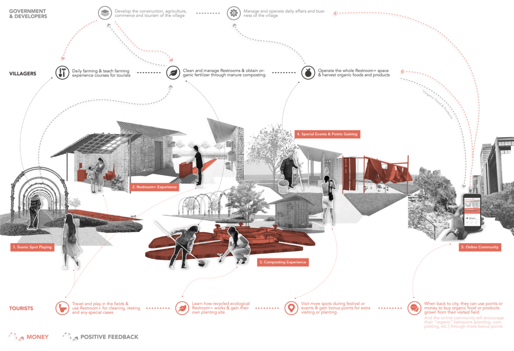 Rural Public Restroom+ is a bold proposal for the upgrading of rural public toilets based on the current rural China. By providing a new way to build recyclable ecological public toilets adapting to local conditions, the new places of restrooms will transform the villagers from owners of private, dirty and disordered dry latrines to the co-operators of public spaces and resources. Through this project, villagers and foreign tourists will encounter, which not only improves villagers’ and tourists’ quality of life and experience, but also creates a cooperation platform for villagers, developers, government and other more participants. Rural public restroom+ aims to become a new path to rural economic and cultural development through reservation and redevelopment of Chinese farming wisdom, and to promote the sustainable production and consumption of organic food in both rural and urban areas.