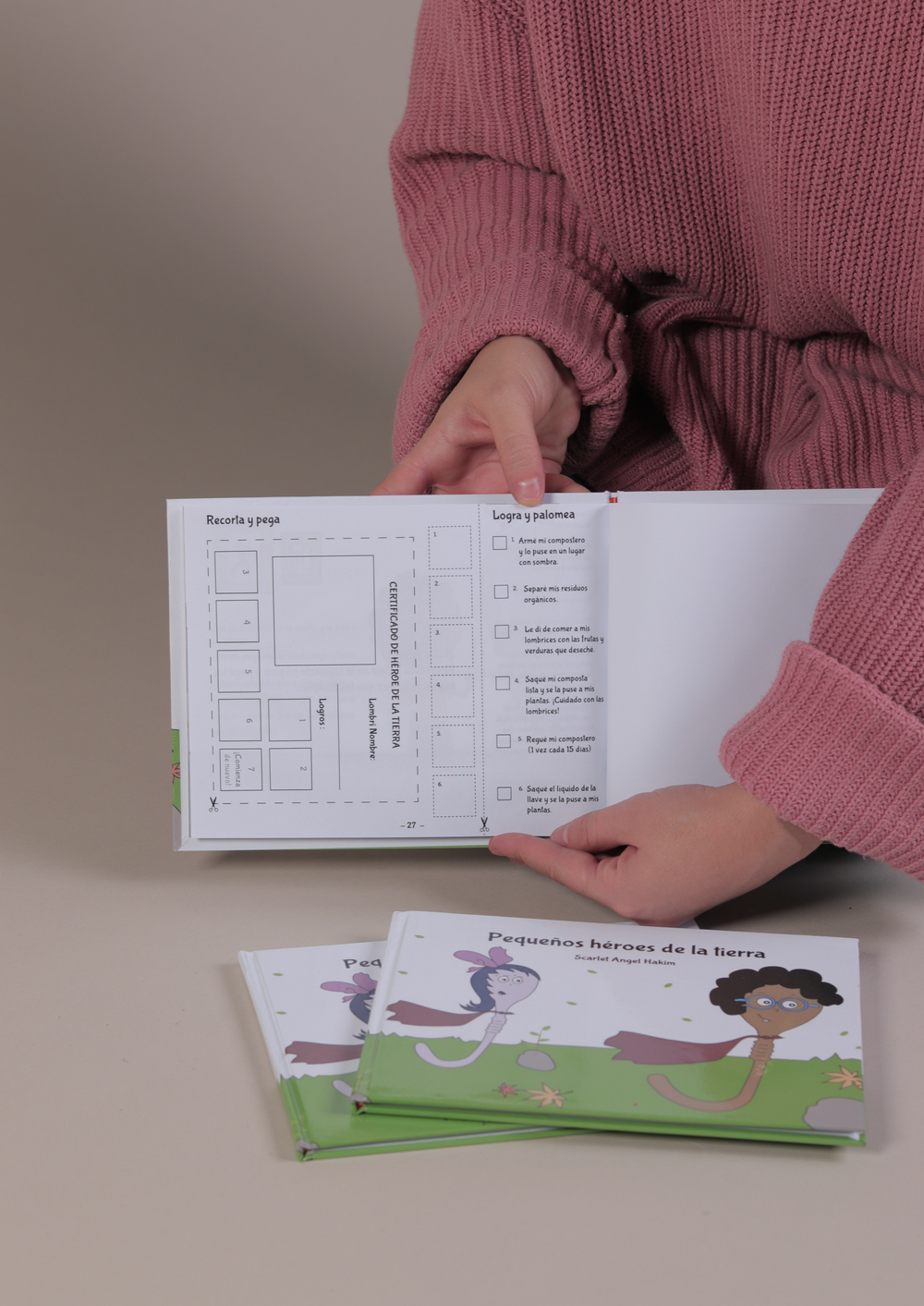 The final product consists on an educational kit, which has two complementary elements for the fulfillment of the proposed objective to solve and approach the main problem. 1. An informative and interactive story- A cue to enter the world of composting: how does it work, how can it benefit our everyday, and the value of composting. It includes an activity that gives guidelines and motivation points so the kids keep composting their organic waste as time passes, by making it a habit. This final activity is called “Hero’s certificate”. 2. Educational compost bin for children- They will learn in a practical way to assemble and generate their own compost, taking advantage of their organic remains with the reintegration of soil into the earth. The compost bin will help them understand through experience how does this natural process works and what are the steps or layers in vermicompost. The “magical” process is demonstrated.