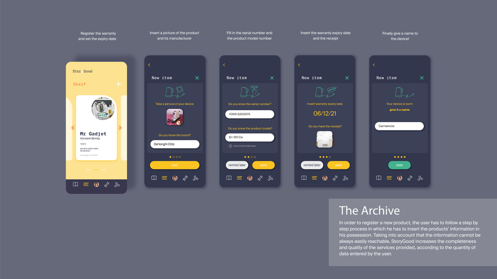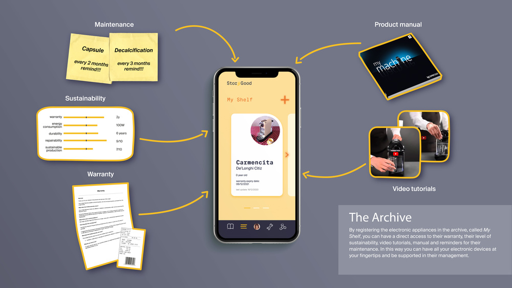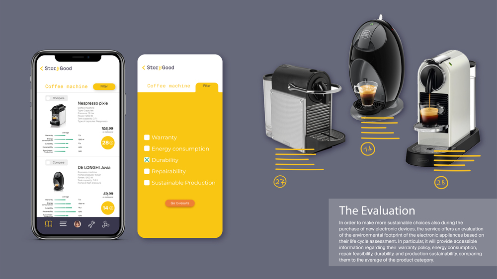 Electronic devices could last longer and be less harmful for the environment, but is quite challenging for the single citizen to take action alone. StoryGood is a platform that enables users to manage and maintain electronic appliances in a sustainable way, offering: an archive, the evaluation of products’ sustainability and a local network. The archive allows users to have all the information regarding their devices at hand (warranties, manuals, the level of sustainability and tutorials about maintenance), in order to help them in their management. Products are evaluated in terms of sustainable production, durability, energy consumption, repair feasibility and warranty, helping citizens to consciously select new appliances. These data are retrieved from companies’ sustainability reports, assessments of repair associations and users’ feedbacks. A network of local repair centers, events about repair and refurbishment shops will be at the users’ disposal when they need professional and direct support for repairing or to give away a product they no longer use. Users will be awarded through points that will be collected to reach community goals for a more sustainable city and measure their own impact on the local environment.