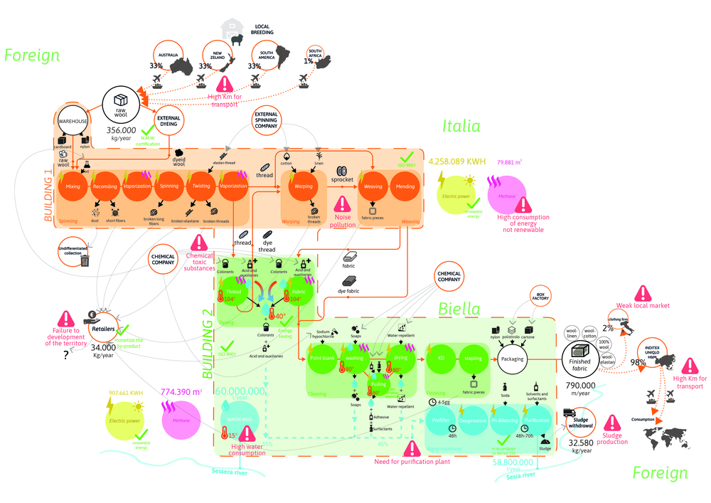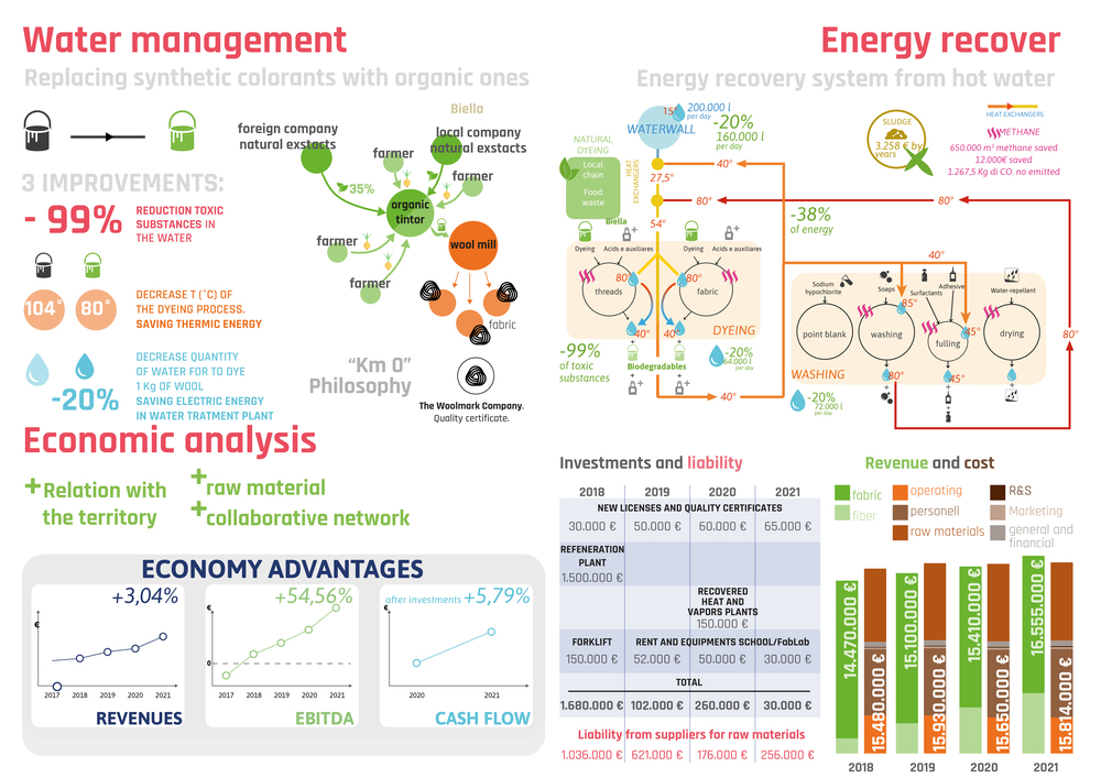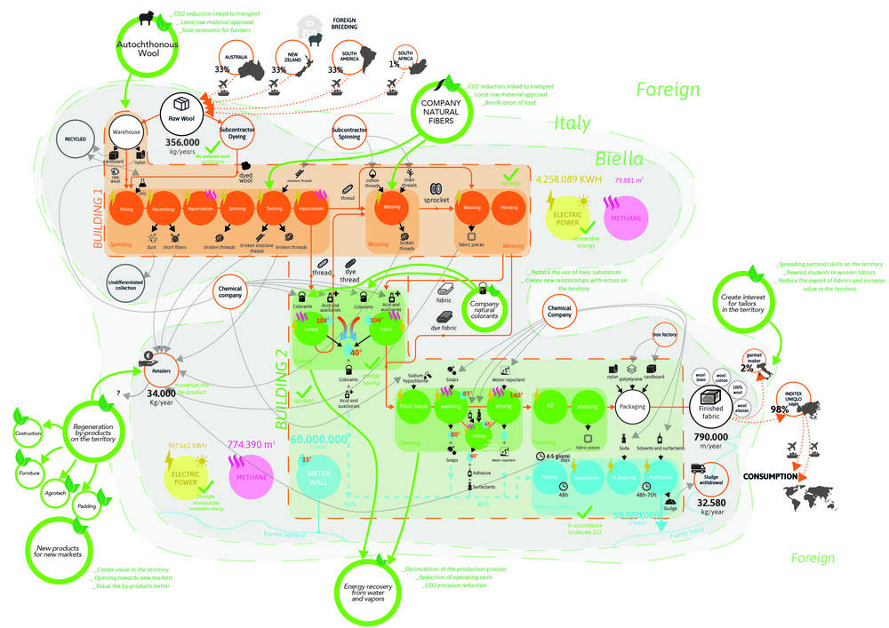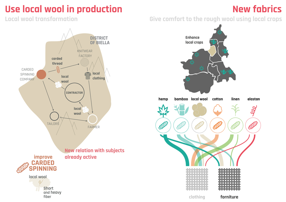 Design system based on quality of both input and output flows. Different solutions solved problems of textile industry in the Region, creating new business involving local stakeholders. Reduce carbon footprint increasing use of local wool, reducing 40% wool imported from other continents. Mix local wool with local fibers such as hemp and bamboo to improve fabric quality and enhance these crops. Create link between enterprises, technical college and artisanal tailoring to improve their know-how.