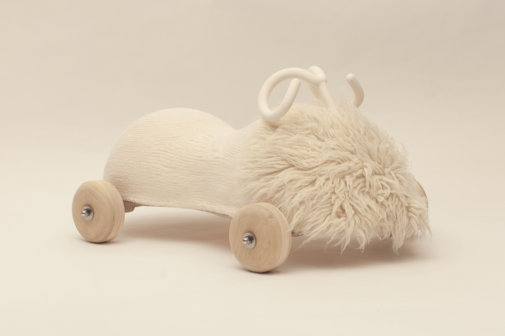 Saving endangered sheep breeds by driving toy cars, made almost completely out of wool and other sheep farm-based materials. It contains wool, casein plastic, milk paint, bioresin, and lanolin. As wool from rare breeds is often not suitable for the fashion industry due to its coarseness, I questioned whether wool has to be considered a soft material. This research led to the creation of eco-friendly fiberglass-type material, by reinforcing bioresin – extracted from agri waste – with wool fibers.