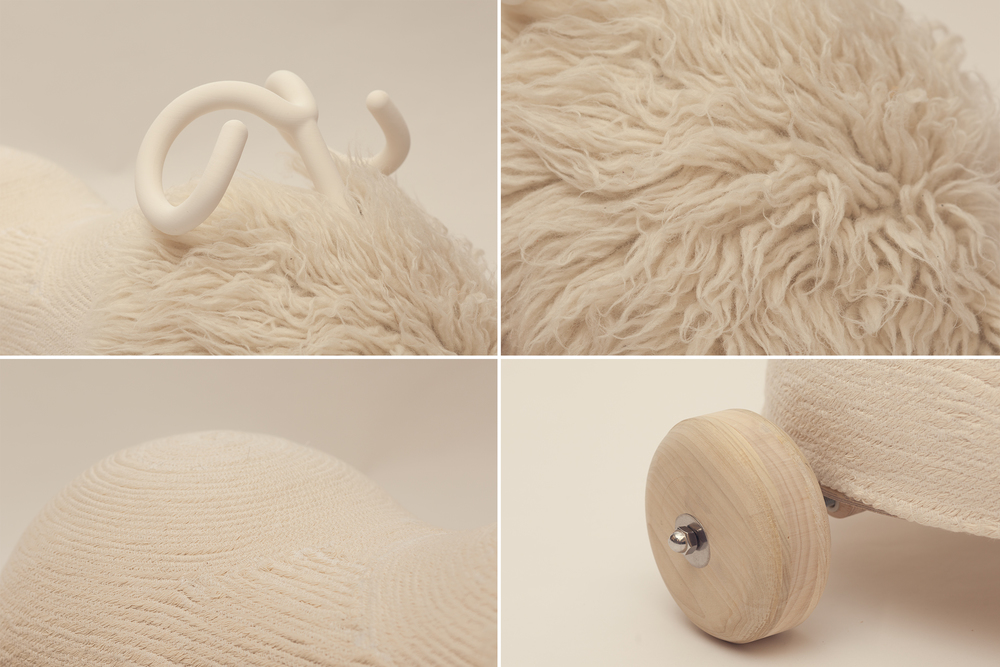 Introducing children to the fantastic variety of sheep characters and their peculiarities will foster a sensitivity to biodiversity at an early age that children will carry into adulthood. This is enhanced with details of sheep morphology and the tactile qualities of the different materials including soft and hard wool. The body of the car is made of a resin-wool composite of which the resin is extracted from agricultural waste to make a degradable eco-friendly fiberglass. The steering wheel is painted with sheep’s milk paint, the mechanical parts are lubricated with lanolin, and the upholstery is made of wool. The manufacturing involves techniques ranging from weaving and felting to CNC for mold-making and casting. Wool-on-Wheels makes room for the wool of various undervalued breeds by introducing products for a wider range of tastes and qualities. With a fleet of toy car models varying in character, color, texture and form, Wool-on-Wheels has the potential to spark a playful discussion and awareness in parents and their young drivers.